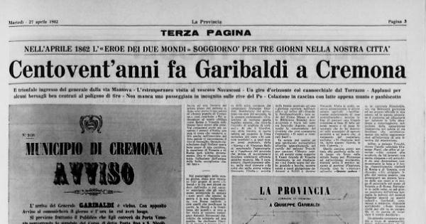 La prima notizia di un imminente arrivo del generale viene pubblicata in prima Pagina dal bisettimanale «Il Corriere Cremonese» (giornale politico-letterario che usciva il mercoledì e il sabato — abbonamento annuale L. 16 — direttore e proprietario Fulvio Cazzaniga) il 19 marzo 1862.