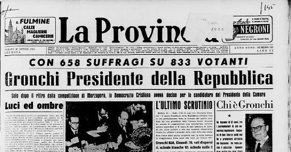 Ecco l'esito della quarta votazione (per la quale bastava la maggioranza della metà più uno) su votanti 833: Gronchi 658, Einaudi 70, voti dispersi 11, schede bianche 92, schede nulle 2.