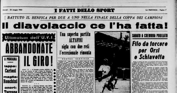 Effettivamente, la partita di oggi è stata, a giudizio unanime dei tecnici, una delle più belle finora giocate sul prato di Wembley ed il Milan ha pienamente meritato la vittoria. I due gol dei rossoneri non hanno costituito una sorpresa per i 45.000 spettatori, perchè già nel primo tempo i giocatori milanisti avevano fallito un buon numero di occasioni, manifestando ampiamente la loro superiorità. Se non fosse stato per l'imprecisione degli attaccanti al momento di tirare in porta, e per alcune autentiche prodezze di Costa Pereira, la squadra italiana probabilmente avrebbe vinto con un margine maggiore. Nel Milan di oggi, praticamente, non ci sono stati punti deboli. Nei reparti arretrati, Maldini è stato un centromediano senza debolezze ed ha dominato a metà campo. Altafini ha guidato superbamente l'attacco e, dopo i due gol segnati oggi, guida, con 14 reti, la classifica dei cannonieri della Coppa, avendo scavalcato Ferene Puskas del Real Madrid. Sempre nei reparti avanzati, il giovane Rivera ha confermato di essere una mezz'ala di valore mondiale. Nel settore sinistro, Trapattoni e Mora sono apparsi onnipresenti.