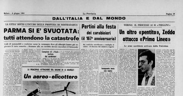 Parma sotto l’incubo della catastrofe. Le prime roulottes hanno preso la strada al tramonto: così è iniziato quello che viene definito come «l’esodo di Nostradamus». Secondo questo alla sesta ora del sesto giorno del sesto mese di questo nostro 1981 sulla città si dovrebbe scatenare un vero e proprio finimondo. Contemporaneamente centinaia di automobili hanno imboccato le principali arterie che si dipartono dalla città, alcune cariche di tende e del necessaire da campeggio, altre delle provviste per rifornire la casa di campagna. Meta comune: una «terra promessa» dove sfuggire alla funesta quanto fantomatica profezia che vorrebbe «Parma delenda». Altri ancora hanno deciso di attendere nella quiete di qualche albergo di campagna o dell’Appennino: i registri di molti hotel e pensioni hanno così presentato il tutto esaurito.