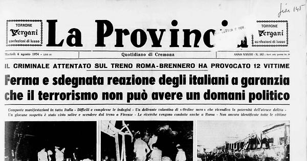 Nella notte tra il 3 e il 4 agosto un ordigno è esploso sul treno «Italicus» Roma-Brennero mentre il convoglio usciva da una lunga galleria. La carrozza sulla quale è avvenuta l’esplosione è stata letteralmente sventrata e si è incendiata. Il treno ha proseguito per qualche centinaio di metri fino a giungere nella stazioncina di S. Benedetto Val di Sambro, dove sono state iniziate le operazioni di soccorso.