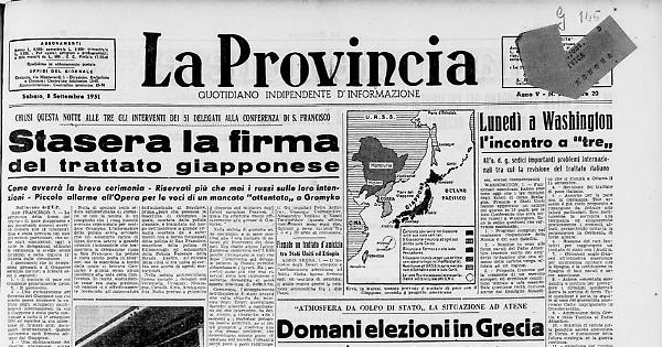 Secondo gli ambienti bene informati, la firma del patto bilaterale di sicurezza tra gli Stati Uniti e il Giappone avverrà domenica 9 settembre a mezzogiorno (ora locale). La cerimonia si svolgerà non nella sala dell'Opera, dove domani verrà firmato il trattato di pace, ma al «presidio», cioè al Q. G. della VI Armata americana a San Francisco, dove fu firmato sabato scorso il Patto di Sicurezza tra Stati Uniti, Australia e Nuova Zelanda.