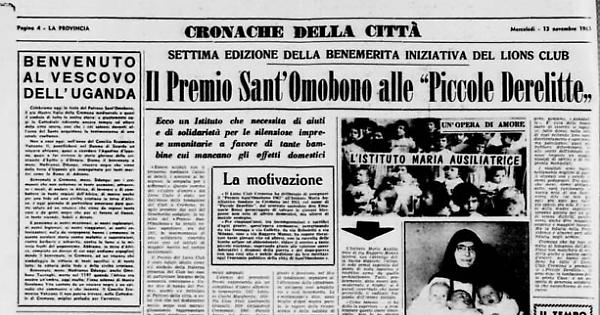 «Il Lions Club Cremona ha deliberato di assegnare il “Premio Sant'Omobono 1963” all'Istituto Maria Ausiliatrice fondato in Cremona nel 1913 col nome di “Piccole derelitte” dal venerato sacerdote don Emanuele Rossi preoccupato di salvare le giovani bisognose non solo di affetto domestico, ma altresì di morale sostegno.