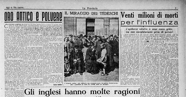Com'è noto, l'ultima grande pandemia d'influenza scoppiò alla fine della prima guerra mondiale, quasi simultaneamente in tutti i continenti, e si calcola che il numero di morti raggiunse l'impressionante cifra di 12 milioni, secondo alcuni Autori, di 20 milioni secondo altri: il Paese che diede il più tragico contributo al male fu l'India, con 6 milioni di morti, cioè la metà del numero totale delle vittime fatte dalla grande epidemia di peste durata ben ventidue anni. Non meno grave decorse l'epidemia in Cina, e particolarmente in Manciuria, dove quasi nello stesso tempo infieriva una epidemia di peste polmonare che, su 50.000 colpiti, aveva dato 50.000 morti! Caratteristico fu il decorso dell'influenza in Italia: i primi casi furono segnalati nell'aprile del 1918 ad Assisi, poi a Terni, a La Spezia, Pisa, Bari e a Taranto, ma il decorso clinico non dette eccessive preoccupazioni ed ai primi di giugno l'epidemia sembrava virtualmente terminata. All'inizio di luglio, invece, la influenza si diffuse rapidamente in Calabria, in Sicilia, quindi in tutte le provincie centrali e settentrionali con sempre maggiore violenza e frequenti esiti letali: fu questa la seconda ondata. La parabola discendente incominciò verso la fine di settembre nell’Italia meridionale, mentre in alcune provincie centrali e settentrionali l'epidemia era ancora nella sua fase ascendente. In complesso, la cifra dei decessi si avvicinò molto ai 400.000.