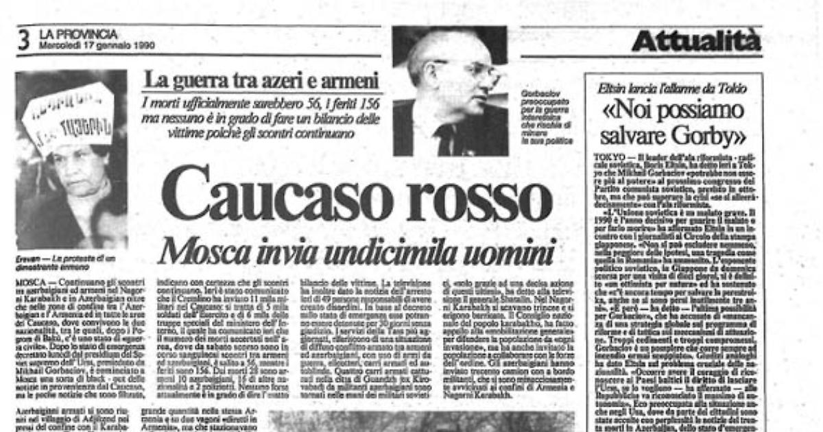 12 gennaio 1989: il Soviet supremo dell'Urss mette il Nagorni Karabakh sotto l’autorità di un comitato amministrativo speciale che dipende direttamente da Mosca.