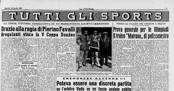 Grande sagra del ciclismo cremonese è ormai diventata la «Coppa Dondeo» che per la quinta volta si è disputata a Cremona domenica scorsa e che è salita ad importanza nazionale perchè valevole per la selezione del «Criterium dei giovani» indetto dalla «Gazzetta dello Sport». Una sagra di colori e di folla che ben degnamente si inquadra nella rinascente primavera e nel magnifico tracciato che dalla pianura porta alle colline piacentine. Un grande nastro d'asfalto da Cremona ad Alseno ed una strada polverosa e malandata da Bacedasco a Castell’Arquato, lunghi rettilinei e ripide salite hanno formato il terreno di battaglia per il centinaio di giovanissimi aspiranti campioni che in due ore e mezzo hanno percorso i 95 chilometri alla media di 38 all'ora.