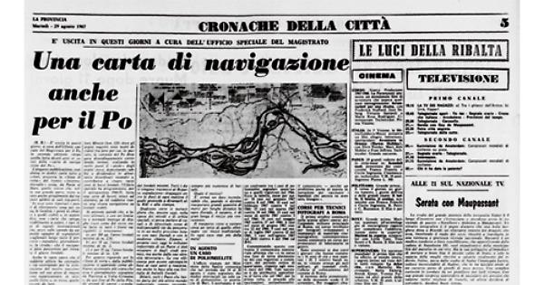L'elegante pubblicazione, suddivisa in dodici carte tutte a colori, presenta la « linea di rotta » del tronco « intermedio-valle » ossia, da Pavia al Mare, quello slesso che, nella sua grande parie, viene usato anche attualmente dai natanti adibiti ai vari trasporti. In esse sono riportati i punii di riferimento zona per zona, le località, i ponti in chiatte e quelli stabili e, in appendice, una « carta che spiega, visibilmente a colori, i vari tipi di segnali internazionali che, posti sulle sponde da apposite squadre di segnalatori scaglionati lungo tutto il percorso « segnalano, giornalmenle, la strada » che il navigatile deve percorrere per trovare il giusto fondale.