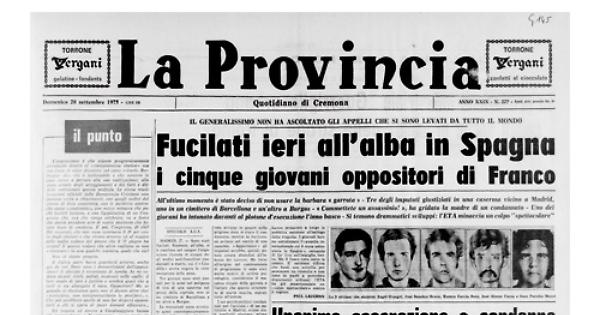 Sono stati fucilati. Stamane, all'alba, si è conclusa nel sangue l'angosciosa vicenda di cinque degli undici anti-franchisti condannati a morte, cui il « Caudillo » aveva negato la commutazione della pena. Tre giovani sono stati passati per le armi nel poligono di tiro di una caserma nei pressi della capitale, uno in un cimitero di Barcellona e un altro a Burgos. Le esecuzioni sono avvenute quasi contemporaneamente alle 8,30, e solo all'ultimo momento le autorità militari hanno preferito accantonare il medioevale strumento di morte della garrota, optando per la fucilazione.