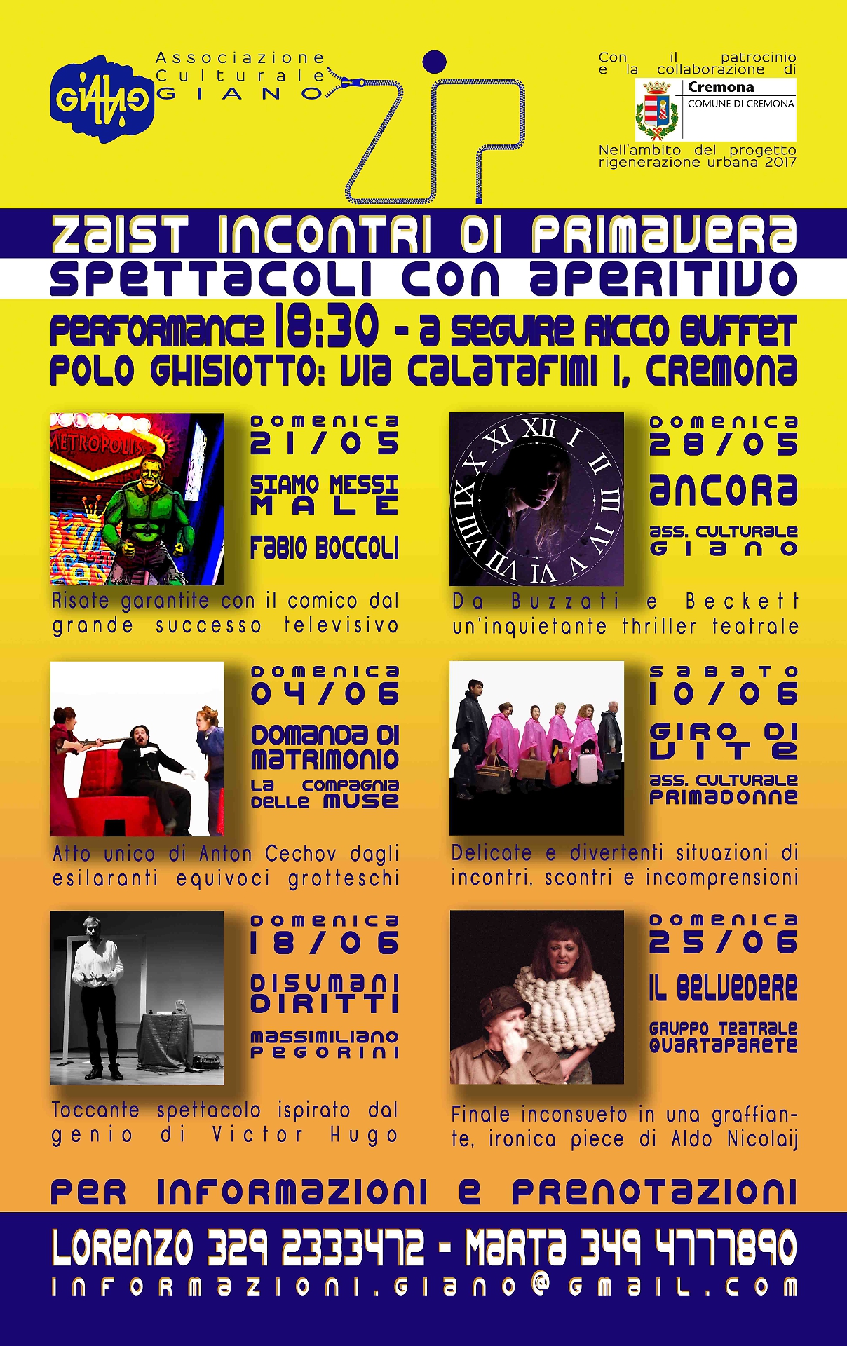 Tutti gli appuntamenti della rassegna si svolgeranno alle 18,30 presso l’accogliente giardino del polo Ghisiotto (via Calatafimi 2 a Cremona), lo spazio comunale sede di diverse associazioni, tra cui l’associazione GIANO che aprirà al pubblico anche lo spazio teatrale in sua gestione. La rassegna si avvale della collaborazione del Coordinamento Teatrale di Cremona ed è volto anche a valorizzare e riqualificare il quartiere Zaist di Cremona, creando frizzanti momenti di cultura, convivialità e condivisione sotto il tiepido cielo primaverile.