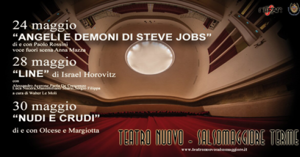 Dal 24 al 30 maggio il Teatro Nuovo di Salsomaggiore sarà protagonista della rassegna "Palcoscenico": una settimana e tre spettacoli, in una formula ideata dai direttori artistici dello stesso teatro con i protagonisti della parola, dando la possibilità al pubblico di essere sul palco, per assaporare l'atmosfera di un punto di vista "altro" da quello che abitualmente viene vissuto, "respirando e condividendo la polvere del palco" con gli attori. Dopo il debutto di sabato 24 maggio con "Angeli e demoni di Steve Jobs" (VEDI APPROFONDIMENTO), si prosegue mercoledì 28 alle 21 con "Line", spettacolo ormai di culto prodotto da Fondazione Teatro Due e tratto dal celebre testo di Israel Horovitz, che porta sul palco la feroce, caustica e surreale competizione per il primo posto di una fila, in cui tutto è consentito, tutto è praticato, tutto è lecito, ma in cui non ci sono vincitori né vinti, perché la partita è, per tutti, già persa in partenza. “Fa ridere e pensare allo stesso tempo Line – come puntualizza Ionesco – è una pièce unica, in cui non c’è azione, non succede niente ma in realtà succede tutto.” Venerdì 30 maggio sempre alle 21 la rassegna si chiude con "Nudi e crudi" di e con Massimo Olcese e Adolfo Margiotta. I due attori e cabarettisti dopo aver partecipato negli anni Novanta a un paio di trasmissioni di Serana Dandini, quindi in altre trasmissioni Rai e nel 1999 alla trasmissione di Adriano Celentano "Francamente me ne infischio", tornano insieme con uno spettacolo in cui danno corpo e voce a tutte quelle idee che hanno ammucchiato nei cassetti nel corso degli anni. Personaggi, gags, canzoni, follie, battute a perdere prendono vita in uno show completamente nuovo, mai visto e cucito in maniera differente di serata in serata. Margiotta è anche stato protagonista di una delle ultime campagne pubblicitarie dell'acqua Brio Blu di Rocchetta.