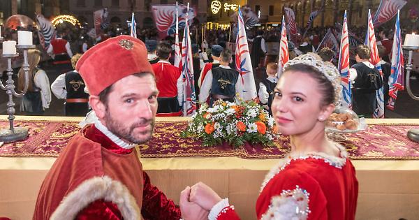 I figuranti del corteo, agghindati in sofisticati costumi medievali, in una danza di bandiere scandita dal ritmo dei rullanti e dal suono delle trombe, hanno attraversato il centro storico per confluire in piazza del Comune, accolti da una folla plaudente.