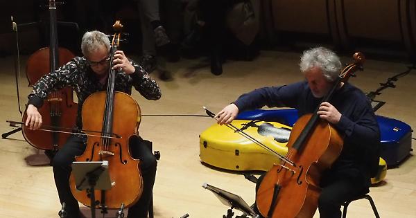CREMONA - Inizia con un omaggio al popolo ucraino la prima serata all’Altra anima del violino, ieri sera nell’Auditorium di piazza Marconi. Mario Brunello e Giovanni Sollima hanno scelto infatti di suonare l’intera scaletta del loro concerto posizionando due custodie da violoncello proprio al centro del palco riproducendo la bandiera dell’Ucraina: l’una interamente gialla e recante l’iconico profilo della copertina di London Calling dei Clash (ma nella quale un violoncello prende il posto del basso), l’altra completamente blu e ornata dei soli versi «Questa terra è la tua terra», tratti dalla celebre canzone di Woody Guthrie. «Oggi abbiamo deciso di usare queste custodie» spiegano al microfono introducendo il concerto, salutati da un applauso.