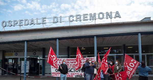 CREMONA (3 maggio 2021) - Presidio dei Cobas questa mattina davanti all'Ospedale Maggiore di Cremona. La protesta sindacale organizzata a tutela degli addetti alle pulizie e alla sanificazione. Sono circa 120 le persone coinvolte da un cambio nell'appalto e «inquadrate contrattualmente senza tenere conto delle mansioni, oltre a una riduzione drastica dell'orario di lavoro».